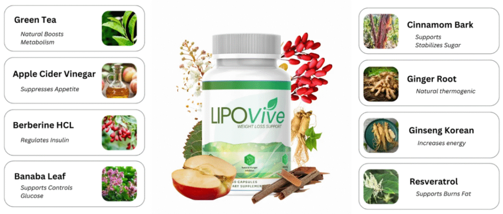The strength of LipoVive comes from its carefully selected natural ingredients. Each one has been studied for its unique health benefits, and together they create a powerful synergy that supports weight loss, metabolism, and overall wellness:
